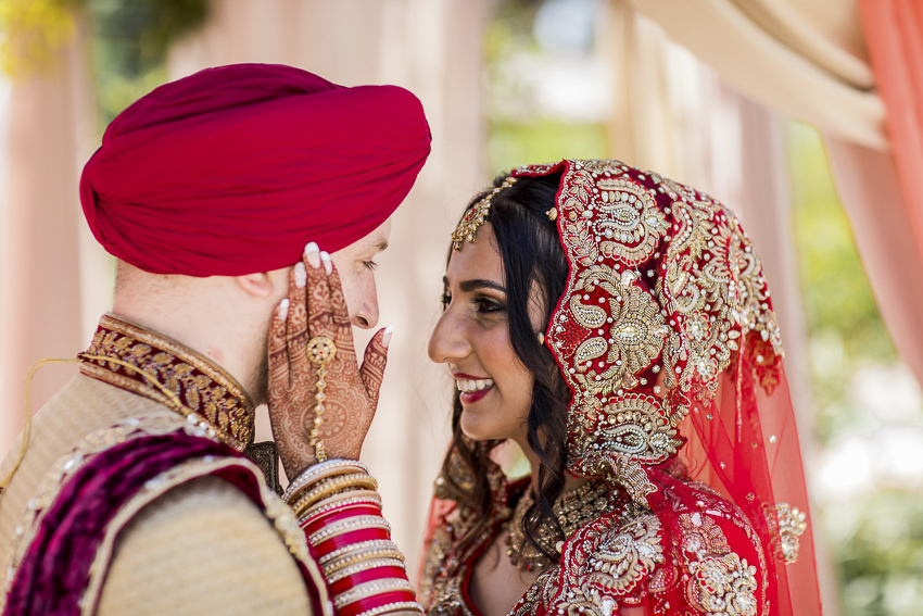 The wedding festivities kicked off with a traditional Mendhi party. The next day, the bride and groom gathered with their family and friends for the wedding celebration. The couple decided to have two ceremonies, the first traditional Sikh ceremony that reflected the bride’s heritage and honoured her family and afternoon civil ceremony. For Shikh wedding ceremony Chrisy wore traditional red dress complimented by gorgeous gold jewellery. For the civil ceremony, she chose traditional ball gown wedding dress. Maria Arana from Mag took care of hair and makeup.